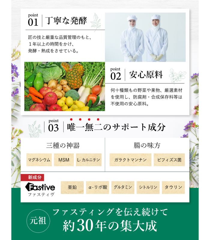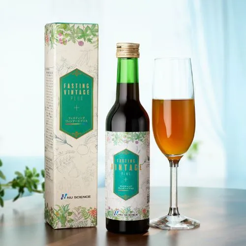 「ファスティング・ヴィンテージプラス」は、岡山県吉備高原の契約農家によるオーガニック栽培を中心とした、 約 60 種類のハーブ、野菜、果物を、50 種類以上の乳酸菌や酵母の力で自然発酵、自然熟成させています。 酵素は 65% の高濃度 で、まさに酵素のかたまりです。標高1000 m以上、昼夜の温度差が激しいモンゴル地域で採取された乳酸菌やMSM、しょうが、カルニチン、マグネシウムをプラスし、飲みやすさやファスティングのしやすさもアップさせました。保存料や香料は一切無添加です。