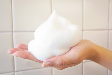 泡立てネットを使えば、大豆粒ほどの量でみるみる泡立ちます。たっぷりの泡で汚れを吸着させながら汚れを落としましょう。