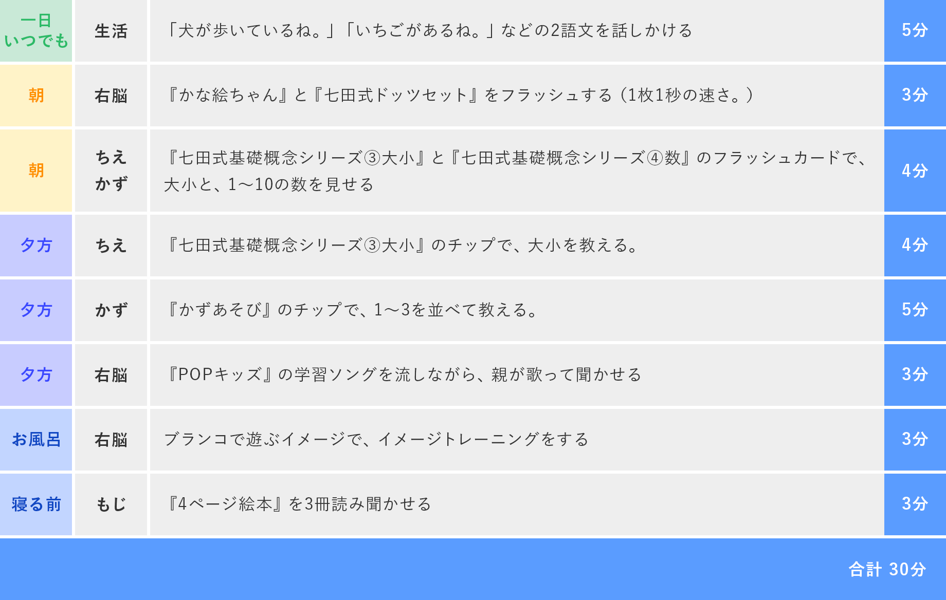 実際に取り組んでみて、言葉の発達や記憶力が育っていることを感じています。 『4ページ絵本』の読み聞かせを始めて1か月たったころから、絵本と同じような場面になったときに、ストーリーを口ずさむようになりました。 特に感動したのは、絵本に出てくる「ごめんなさい」を覚えて、自分の言葉としてつかえるようになったことです! ひらがなへの興味も高まり、絵本を見て、知っている文字を読んでくれたり、ゆっくりですが、単語を読んでくれたりなどが増えてきました。これからも長く、七田式を取り入れた育児や取り組みを続けていきたいと思っています。