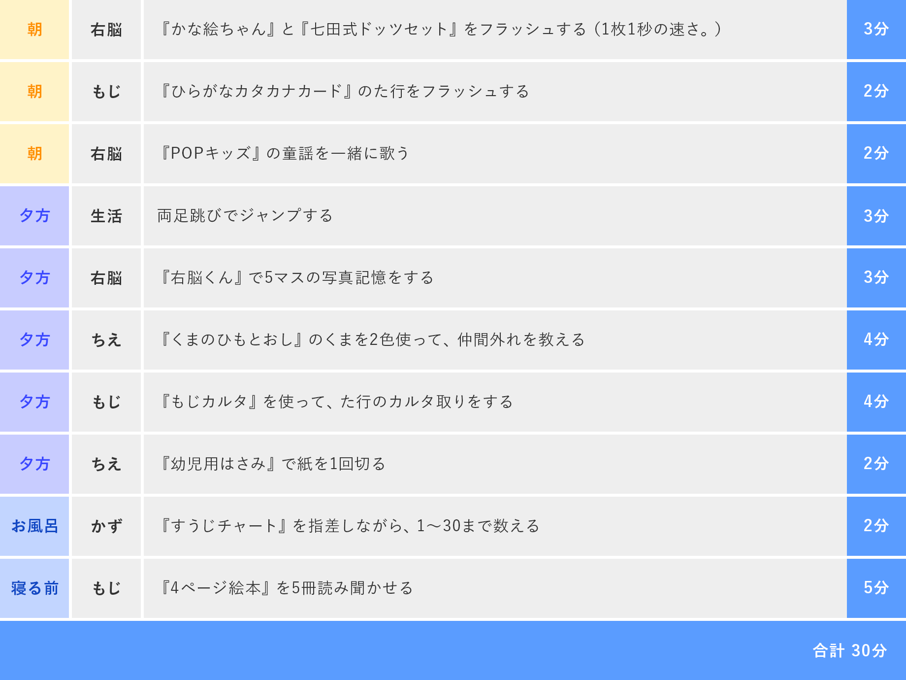 暖かく包み込むような七田式の取り組みを通して子供と関わりたいと考え、兄と妹2人一緒に受講しています。 共働きのため、取り組みは夫婦で役割分担・交代制で行っています。カードフラッシュなど、きょうだい共通の取り組みをした後、上の子と下の子に分かれて取り組んでいます。教え方の工夫が夫婦で異なるので、偏らないように、平日・土日で担当を交代しています。 講師の方のアドバイスを取り入れながら、子供やわが家に合ったやり方で、楽しみながら取り組んでいます。