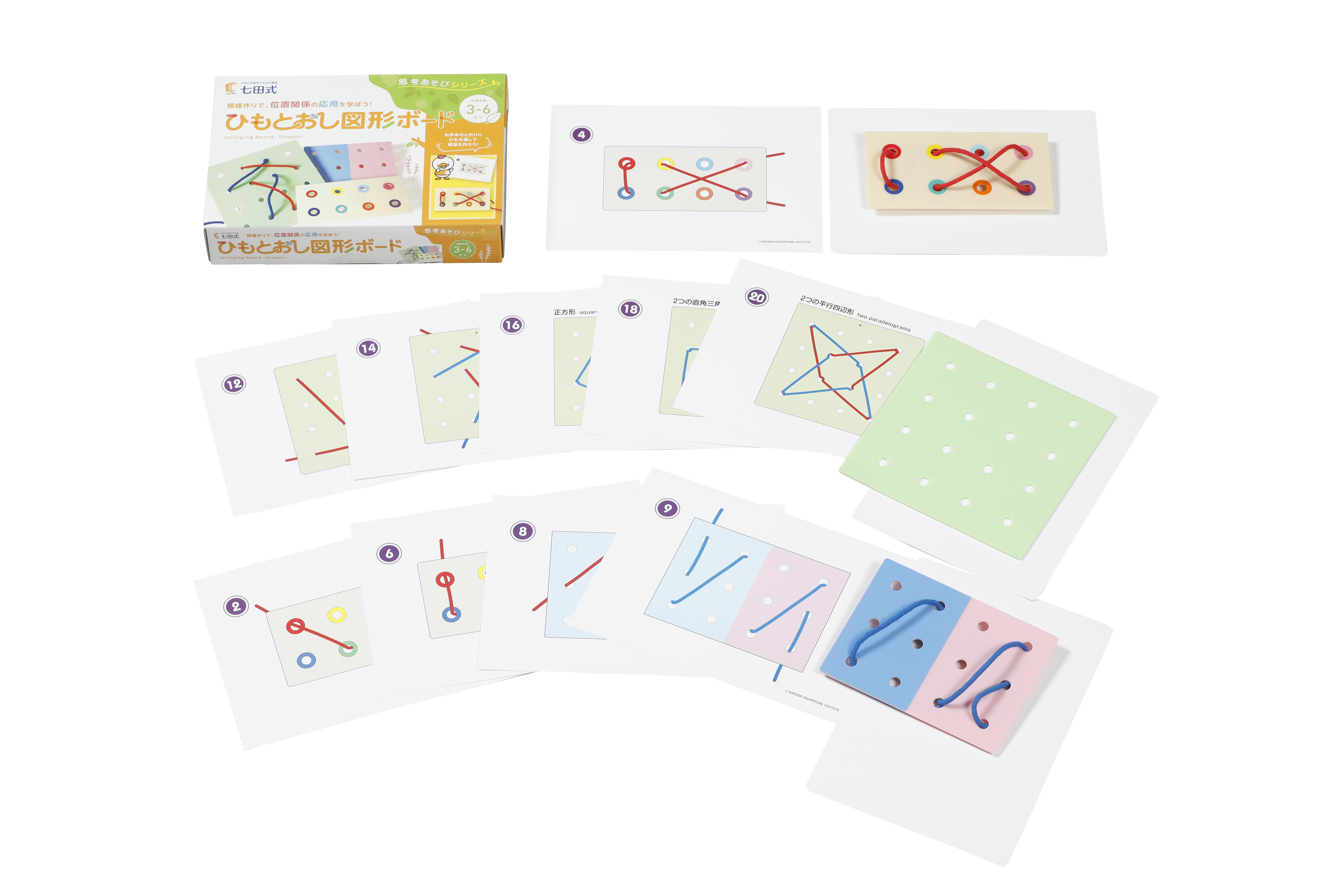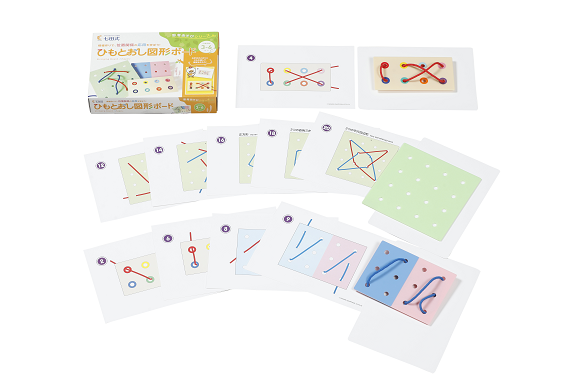 ボードの穴にひもを通して模様や図形を作ることで、位置の関係の理解が深まります。