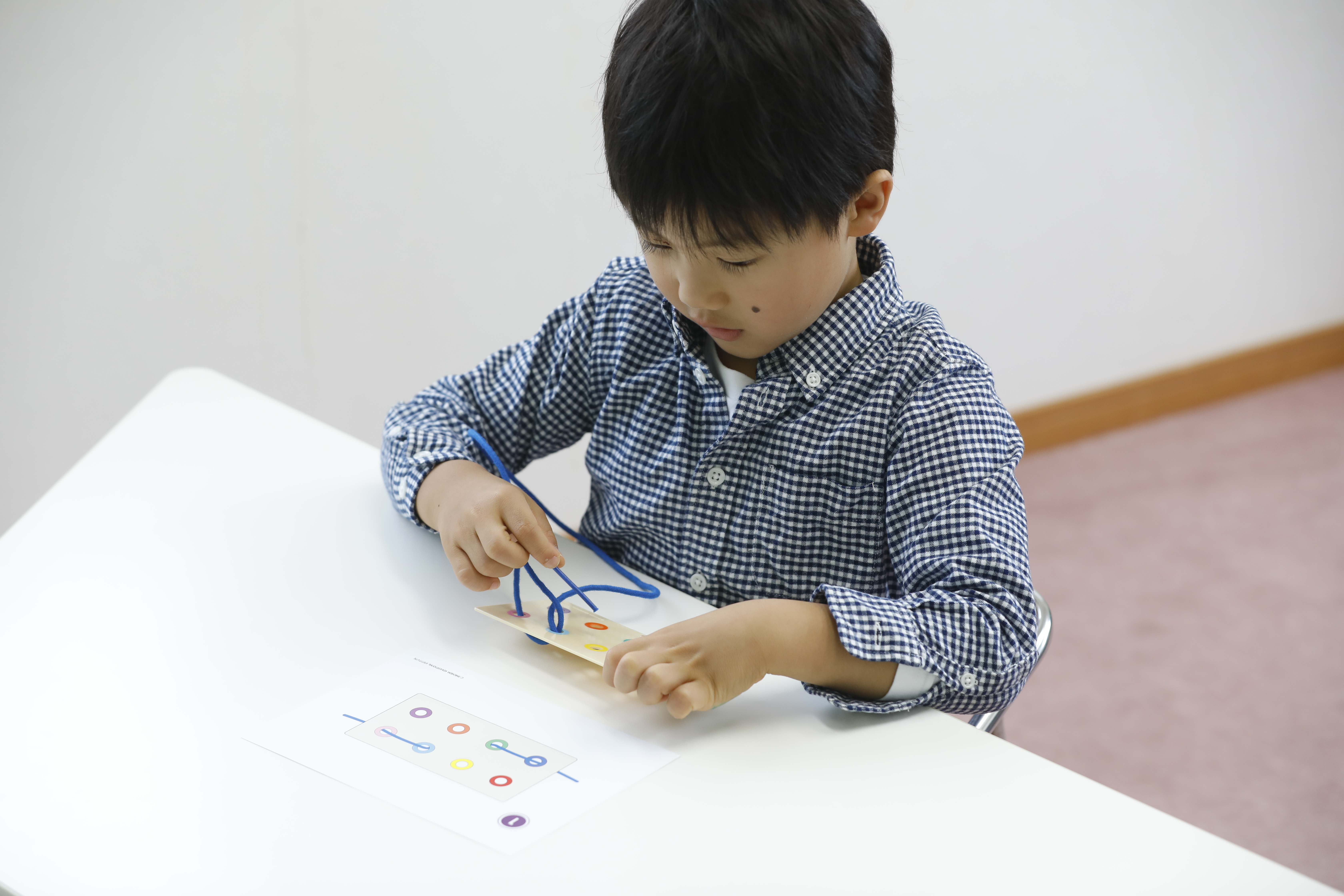 どの穴からどの穴にひもを通すのか、お手本をよく観察しながら取り組むことで、判断力・思考力が育ちます。