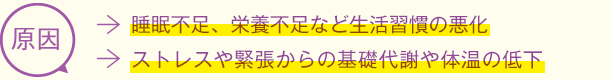 体温が1℃上がると、免疫力は5〜6倍にアップします。しかし、ストレス社会ともいわれる昨今、怒りっぽくなったり、イライラしやすくなります。すると交感神経が優位な状態が長く続くことで、体内で有害物質が増え、さまざまな炎症や病気の原因を作り出すのです。また、ストレス状態では、血管収縮による血流障害が起こり、体温は下がってしまう悪循環となります。体温と、基礎代謝、免疫力は正比例していることを覚えておきましょう。