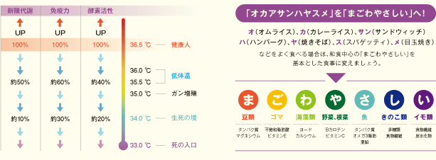 加工品や肉、脂っこい料理ばかりでは、消化酵素を大量に消費 → ウイルスや病原菌と戦う代謝酵素が不足 → 免疫力低下、低体温 → 体内酵素が働かない・・・と、酵素不足、免疫力低下の原因になります。食生活の基本である「まごわやさしい」を意識し、バランスの良い食事を心がけましょう。