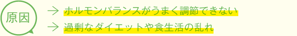 主にホルモンバランスの崩れが関係しています。しかし、誰もが必ずしもこのような症状になるのではなく、栄養素が不足していたり、不要な物が過剰にあることで、ホルモンが十分に分泌されなかったり、分泌をやめるべきホルモンの制御がうまくいかなかったりすることで、不調となって現れます。ダイエットや加工食品、ファストフードが多い食生活は、その原因を作りますが、ただ良い食事をしていても、年を重ねると栄養の吸収が悪くなるため、腸を良い状態にすることも必要です。