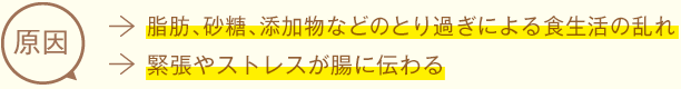 【ストレス】 ストレスを多く受けると、腸がけいれんをして本来の働きを失います。そのため便秘になり、悪性のガス等を発生させるためお腹も張りやすくなるのです。ストレスを受けたことがある多くの方が便秘になるのを体験しているのは、このためです。また、腸内にも悪玉菌が溜まりやすくなるため、腸内環境のバランスがどんどん乱れていくのです。