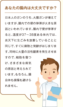 便秘や下痢は病気と見なされないことが多いですが、腸内環境が悪いと、栄養が十分に吸収されず、また老廃物も滞りがちになるので、万病の原因となります。逆に、腸を良くすることで、解消される症状はたくさんあります。健康への最初の取り組みとして、腸の健康を目指すことは重要で、効果的です。「脳腸相関」といって、腸は自律神経で、脳とも直結しているので、腸の状態が良いと精神の状態も良くなります。また、コロコロ便は体の冷えと関係しています。