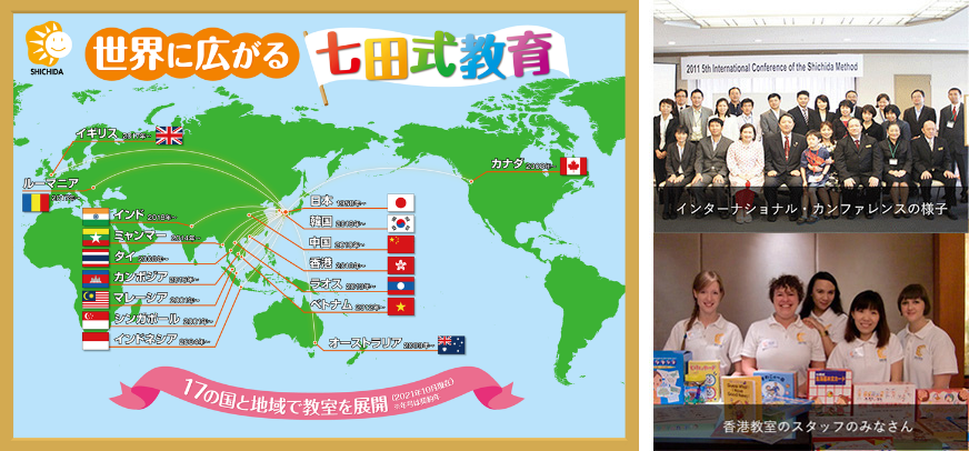 七田式教育は、世界17の国と地域で子供たちの夢を育てるお手伝いをしています(2021年10月現在)。子供に愛情を与え、学ぶ喜びを伝え、その学びを社会の役に立てることを伝える、全人格教育とも言える七田式教育は、国の未来を支えるリーダーとなる子供たちを育てる教育として、世界から注目を集めています。