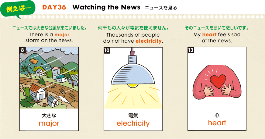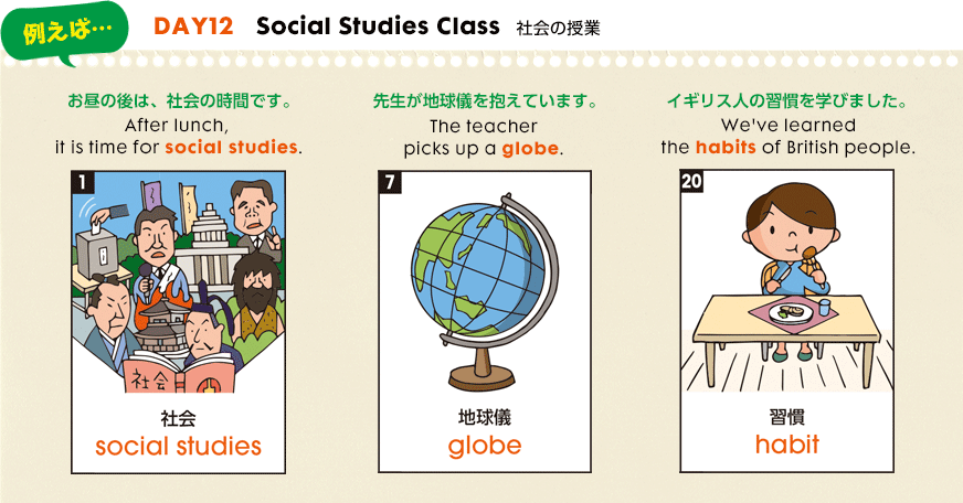 テキストのイラストを見ながら、1日分の25単語を1.5倍速と3倍速で聞こう。各単語の日本語⇒英語を聞いたら、ブランクで声に出して言ってみよう。リズムに合わせて、テンポよく発するのがポイント!