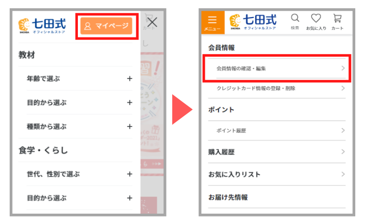ログインした状態で、ページ左上のメニューを開き、「マイページ」に移動し、「会員情報の確認・編集」を押してください。
