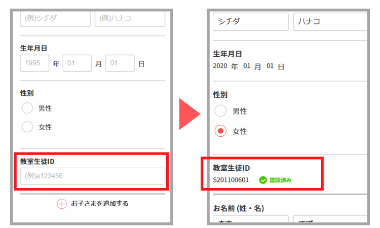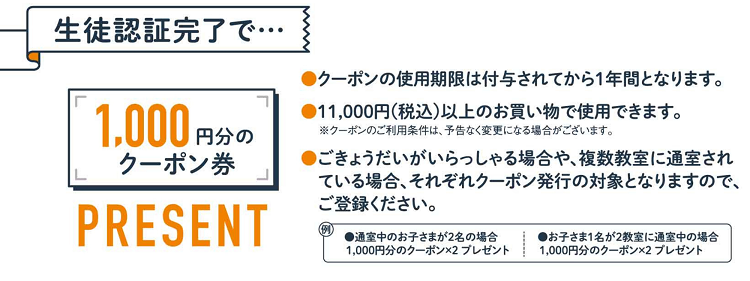 七田式教室に通室中のお客さまは、お客さま情報(WEB会員)のご登録後、「生徒ID認証」を行ってください。お子さまのお名前、生年月日、通室中の七田式教室の生徒IDをご入力いただくと、通室者特典のクーポンをプレゼントいたします。