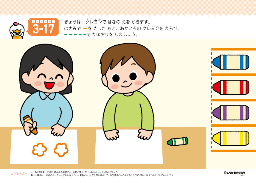 各プリントの下部には、ヒントの出し方や声かけのポイントを掲載しています。迷ったときはプリント下部の「おうちの方へ」や、別冊の「おうちの方への手引き」を参考にしながら、お子さまをサポートしてあげてください。