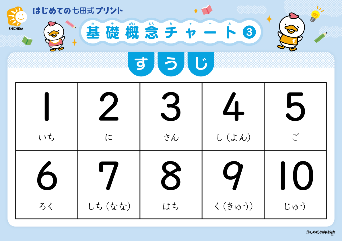 色、形、大小などの基本的な概念から、身近な物の名前や数唱など、のちの学習につながる「ちえ」を学ぶためのプリントです。