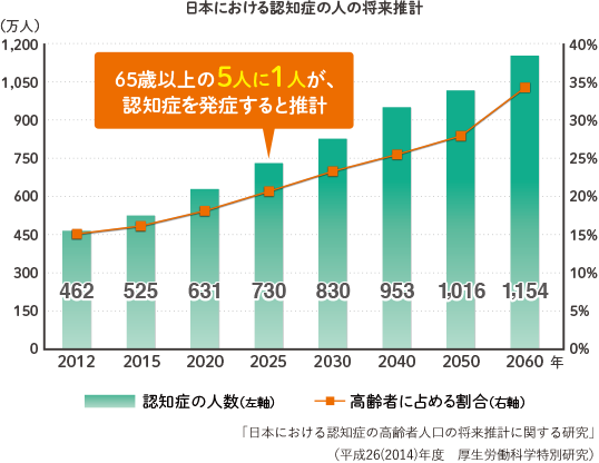 日本は、4人に1人が高齢者という超高齢社会を迎え、急増する認知症高齢者が大きな医療・社会問題となっています。認知症は、記憶力や判断力が低下する病気で、患者さん本人の問題だけではなく、肉体的、時間的、経済的な負担により、ご家族の人生を変える恐れがある病の一つです。たとえ、今は元気でも、年齢を重ねるごとに認知症になる可能性は高まります。