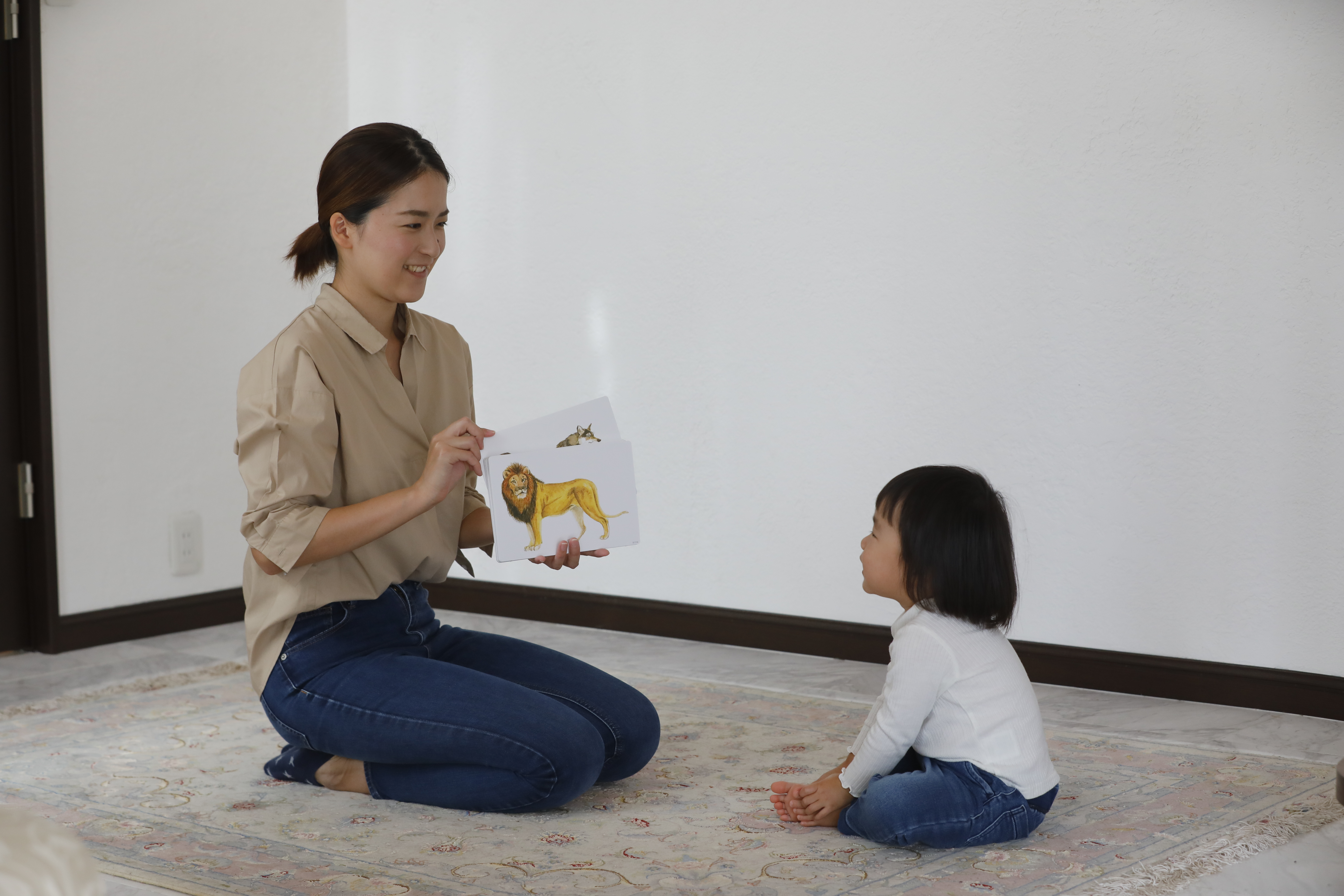 2枚のカードを並べて「〇〇はどっち?」とお子さまに選ばせてあげましょう。正解したらたくさんほめてあげましょう。違うものを選んでも「えらいね。タッチできたね。〇〇はこっちだったね」とやさしく正しい方を教えてあげましょう。