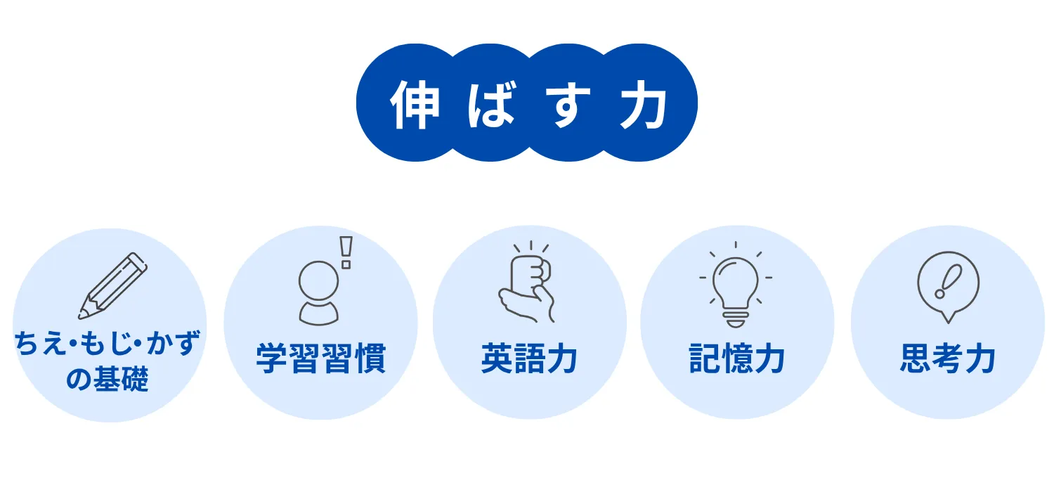 国語や算数といった、就学後の学習の基礎となる3分野の力である「ちえ・もじ・かず」をバランス良く伸ばすことができます。