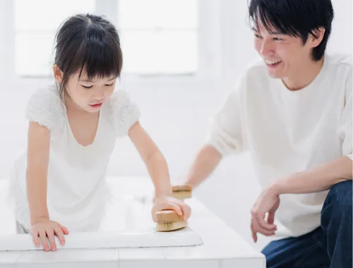 食事の準備や片付け、お風呂掃除など、簡単な家事にお子さまを参加させ、達成感と自立心を育みます。