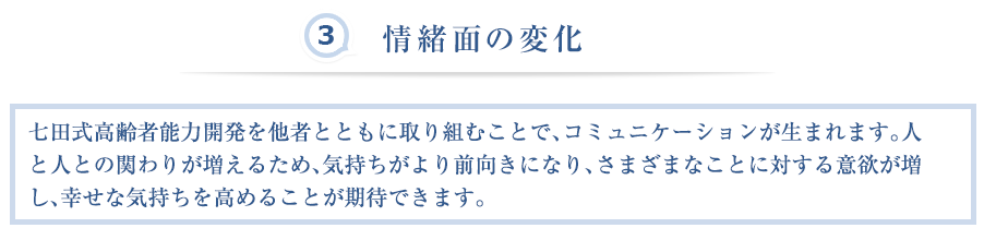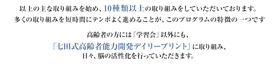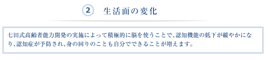 七田式高齢者能力開発で、脳を活性化し、脳の質が変化すると、より一層健康的な生活ができるようになります。