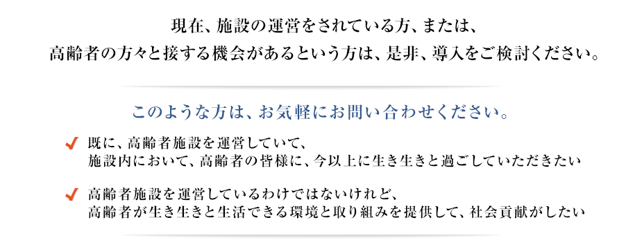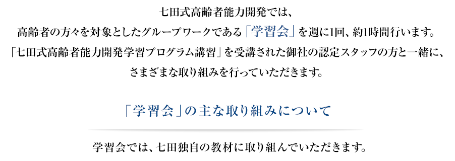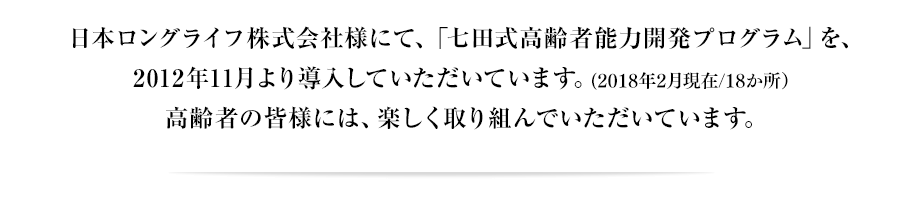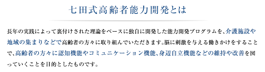 高齢者の方々が精神的・肉体的にさまざまな刺激を受けることで、 加齢とともにできなくなっていたことが、できるようになるだけでなく、喜びや達成感、充実感を得ることができます。