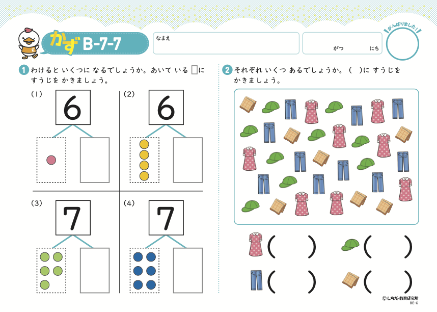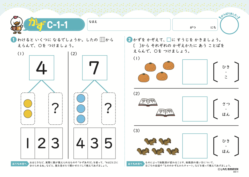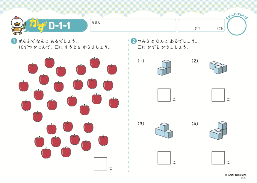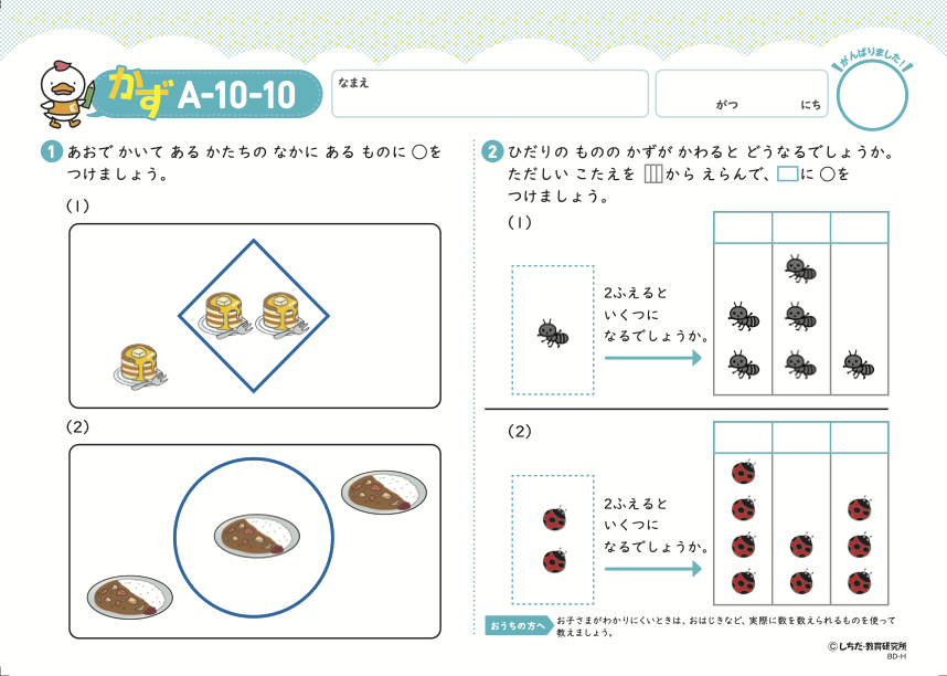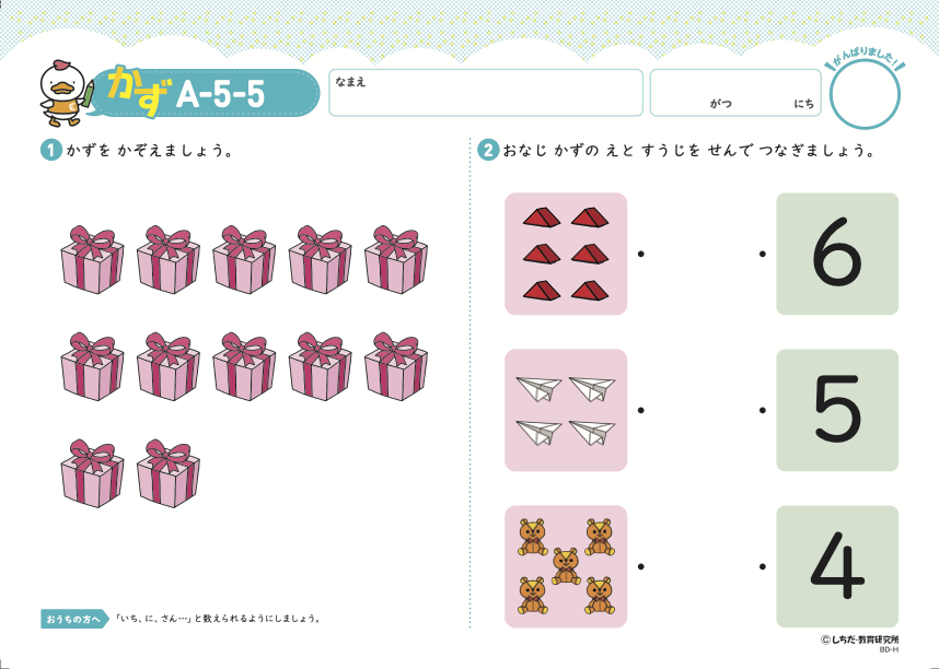 数の認識・対応と合成分解についての知識が高まります。数・量などの基礎概念が身につきます。