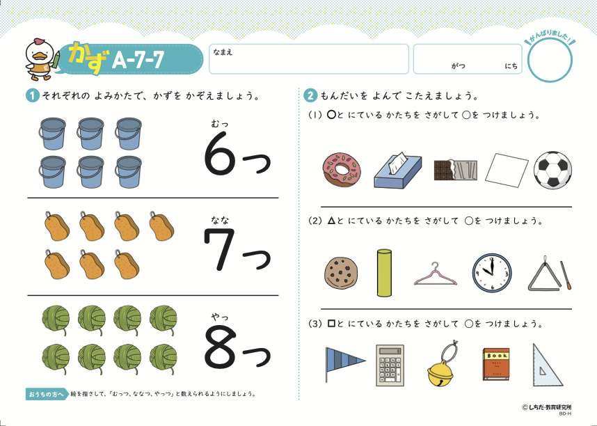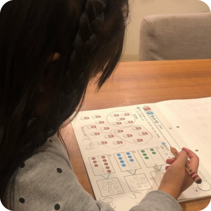数の認識・対応と合成分解についての知識が高まります。形・大小・数・量・空間認識・比較・順序といった基礎概念が身につきます。