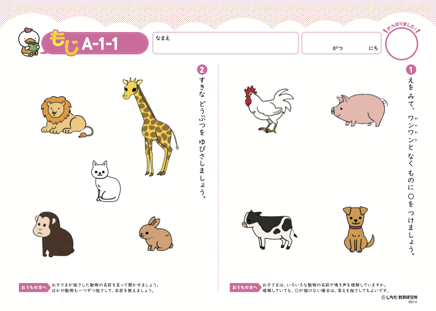 ○・×や線引き、色塗りで身近なものの名前や文字の理解を進めます。 語彙力を養います。