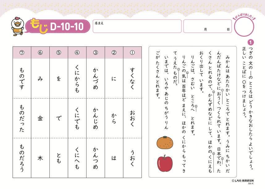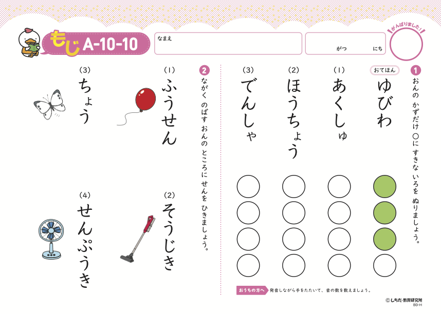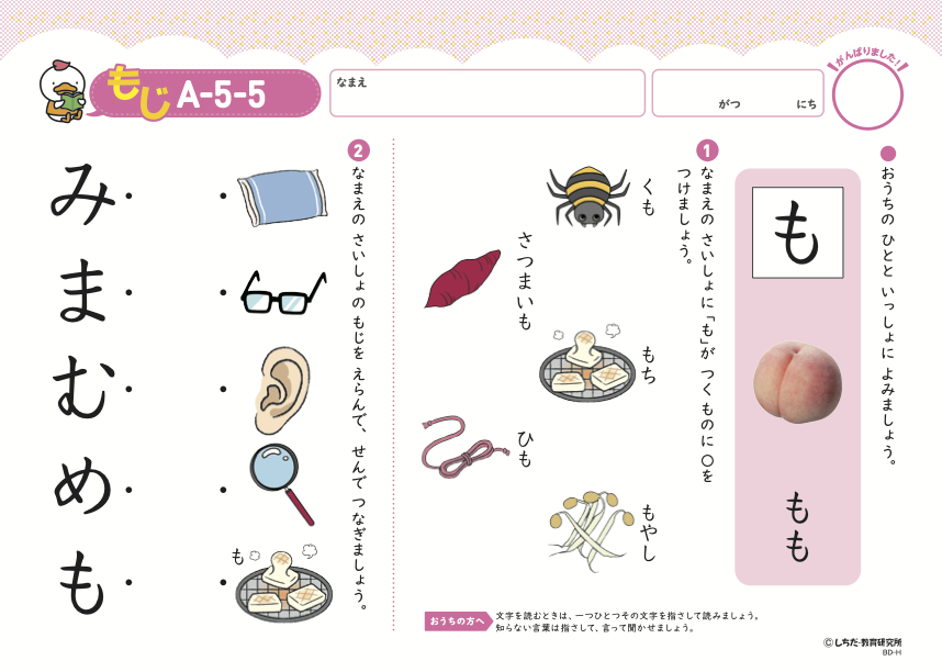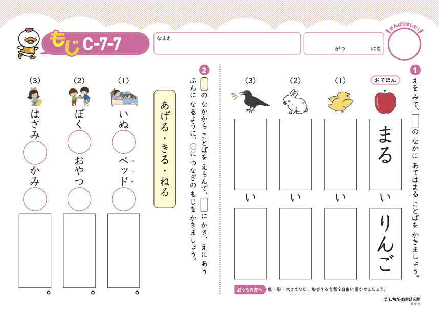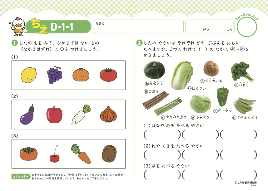 ○・×や線引き、色塗りで身近なものの名前や文字について理解できます。