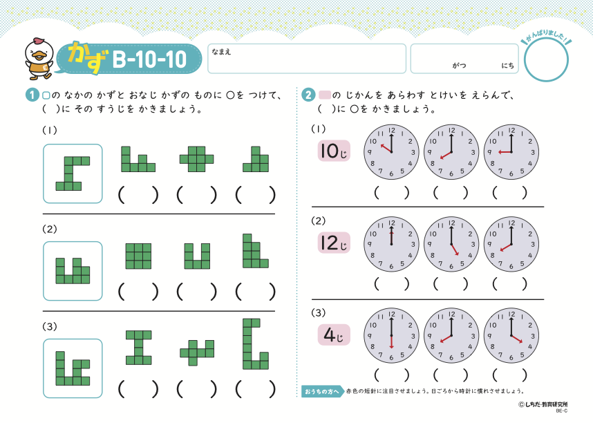 いつの間にか時計が読めたり、自分で問題を作り家族に答えさせることをお遊びにしていたりで、七田式プリントに感謝です。